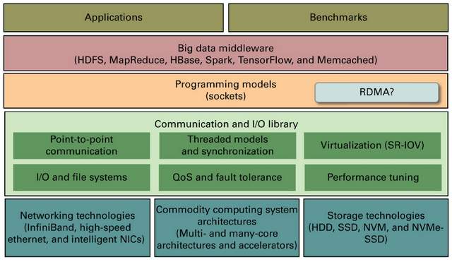 传统上,大数据处理和管理中间件,如Hadoop、Spark、HBase、Memcached等,是在传统的通信和I/O协议之上设计的,如TCP/IP、远程过程调用(RPC)、文件 系统调用等。 这些协议是使用以操作系统为中心的概念和接口构建的,例如套接字、可移植操作系统接口 (POSIX) 等。由于用户空间和内核空间之间的上下文切换和缓冲区复制,这些编程模型通常具有较高的资源开销 。