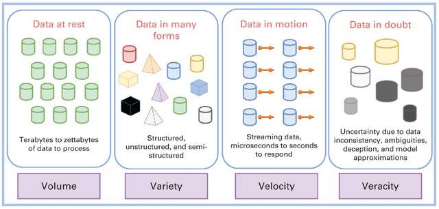 传统上,大数据问题和解决方案以 3V(容量、速度和多样性)为特征。 近年来,又增加了第四个V(真实性)。 数量反映了待处理的静态数据量。 速度是指移动中的数据。 多样性是指必须处理的数据类型的巨大多样性。 准确性是指有疑问的数据。