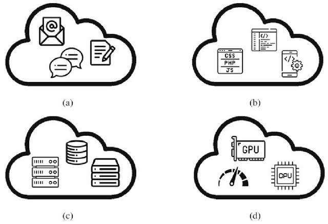 云服务模型: (a) 软件即服务 (SaaS);(b) 平台即服务 (PaaS); (c) 基础设施即服务 (SaaS); (d) HPC 即服务 (HPCaaS)