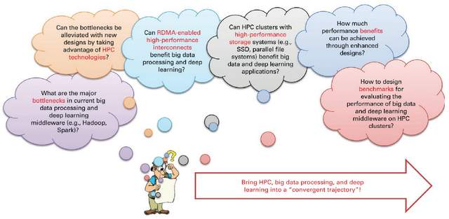 在此背景下,以下四个主要方向出现了具有挑战性的问题:(1)理解大数据的特征和趋势; (2)了解大数据、HPC和深度学习/机器学习之间的相互作用; (3)了解HPC技术(处理、网络、存储)趋势,加速大数据处理; (4) 了解加速大数据处理的好处。