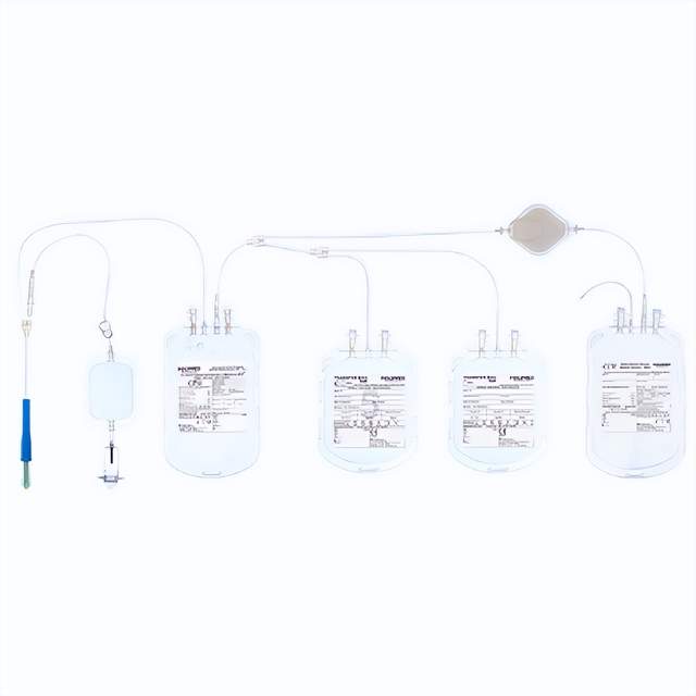 血袋系统由献血袋、供血管(由带针盖的针头、可穿刺和可隐藏的输液罐和夹子)几个部件组成。这些部分协同工作,以确保血液被安全地收集和储存。