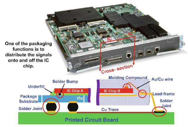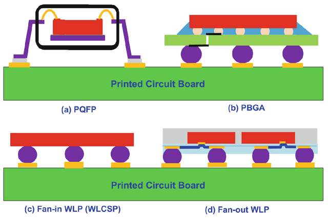 传统封装技术主要利用引线框架作为载体和引线键合进行互连(例如 DIP、SOP 和 QFP) ); 随后出现了引线键合互连与封装基板的结合(例如BGA、Land Grid Array(LGA)等); 后来又实现了封装基板上的倒装芯片技术(例如Flip-chip-BGA)。