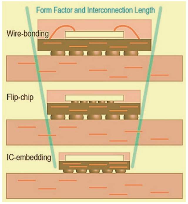 图2. 射频/毫米波技术小型化互连组装方法的趋势。 引线键合作为最传统的低 I/O 互连、低至 25 μm 的 FIP 芯片互连以及 IC 嵌入(IC-embedding)或扇出互连(fan-out interconnection);