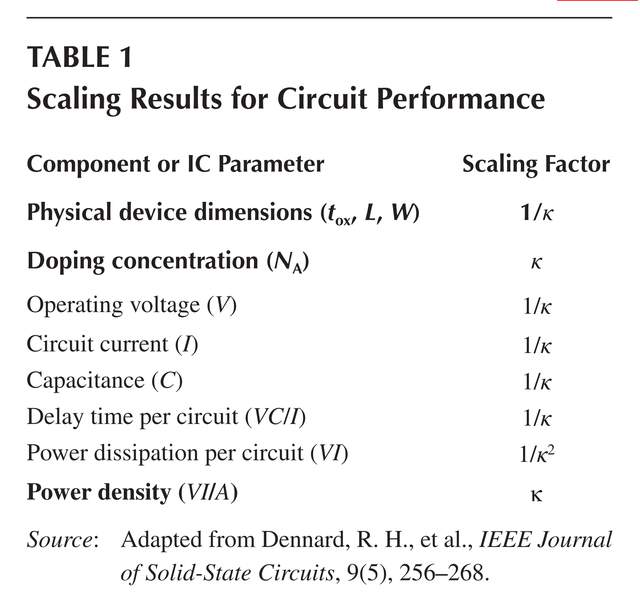 2009 年,IBM 院士卡尔·安德森 (Carl Anderson) 指出半导体技术日趋成熟和指数增长放缓的趋势,类似于之前的铁路、汽车工业和航空业。 摩尔定律与基于 Dennard (1974) 工作的标度定律相关,称为 Dennard 标度。 登纳德缩放与互补金属氧化物半导体 (CMOS) 晶体管中的功率缩放特别相关。 本质上,登纳德缩放定律指出,如果技术的特征尺寸(节点)缩小(通常是通过减小栅极长度),则设定区域的整体 IC 功耗(因此功率密度)保持不变。 Dennard (1974) 提供了电路性能的缩放结果,这些结果已经过调整并显示在表 1中。