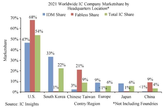 图2,2021年全球IC公司按总部所在地划分的市场份额