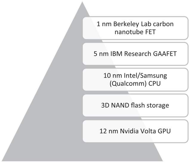 IBM 研究中心提出的 5 nm 栅极长度是一种采用 III-V 族材料的环栅 FinFET 实现,可产生极低的断态电流,近年来已在各种期刊和出版物上进行了研究、原型设计和发表。 2018年时期,尽管距离商业集成还有相当长的时间,但 5 nm 晶体管技术显示出在可预见的未来确保摩尔定律延续的技术前景。 最后,目前正在原型设计中,另一项旨在保证摩尔定律未来的技术是伯克利实验室提出的 1 nm 碳纳米管栅极长度。 1 nm栅极长度晶体管使用过渡金属二硫属化物材料来实现单层栅极沟道,可以不受当前光刻限制的情况下生长。