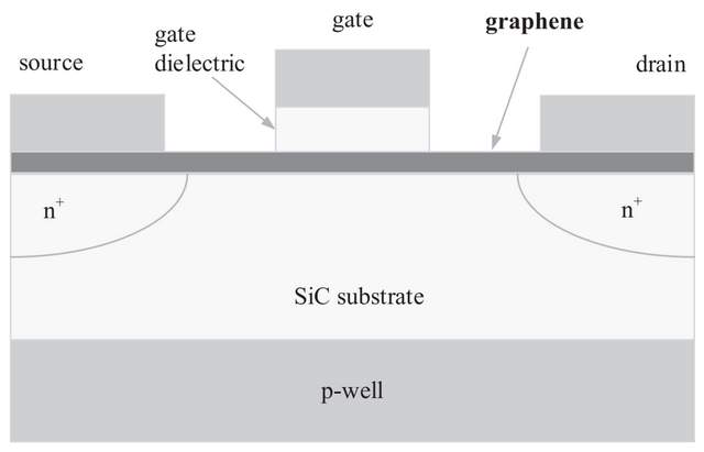 如图 6所示,石墨烯通常外延生长在 MOSFET 的源极、栅极电介质和漏极端子之间的 SiC 衬底上。 外延石墨烯是通过在真空中 1350°C 高温下对六方 SiC 进行氢蚀刻后热分解而产生的。 石墨烯在硅端面和碳端面上生长为多层结构。 石墨烯具有柔韧性和强度(与其碳同素异形体金刚石一样),在半导体行业之外作为树脂中的元素用于制造碳纤维运动器材等固体结构,甚至用于机动车辆制造。 在半导体行业中,基于石墨烯的有源器件具有多种优势,例如:
